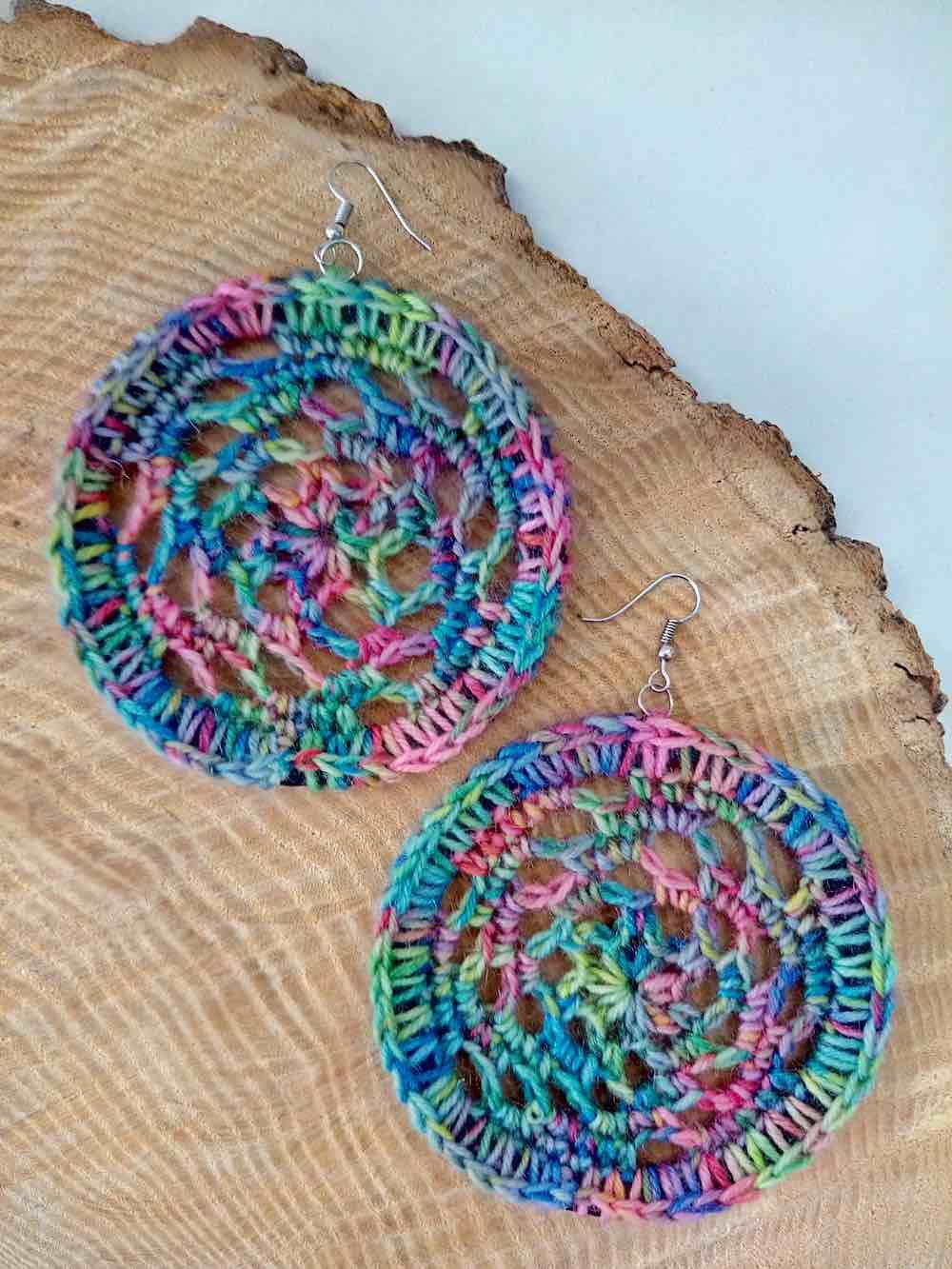 These stunning earrings are hand crocheted to an original design using cotton and bamboo yarn around a 3d printed hoop.