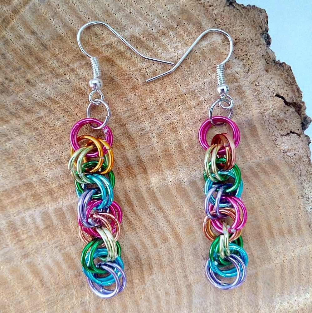They are made using a double-spiral chain weave with coloured aluminium rings to make a rainbow effect.